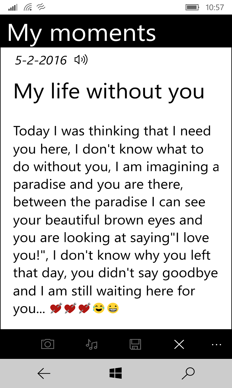 Write and save your best moments that you would like to remember one day!, Write your date's boyfriend/girlfriend or time you enjoyed with your friends yesterday, if You are a person who likes to go to different places or Music concerts you can take pictures and add to the Moment's note you will write. You can add Music (mp3 or mp4) to each Moment's note you write. Customize the App home page with a photo to give it a beautiful look. Saving your best moments will makes you happy in the future when you see it again.
